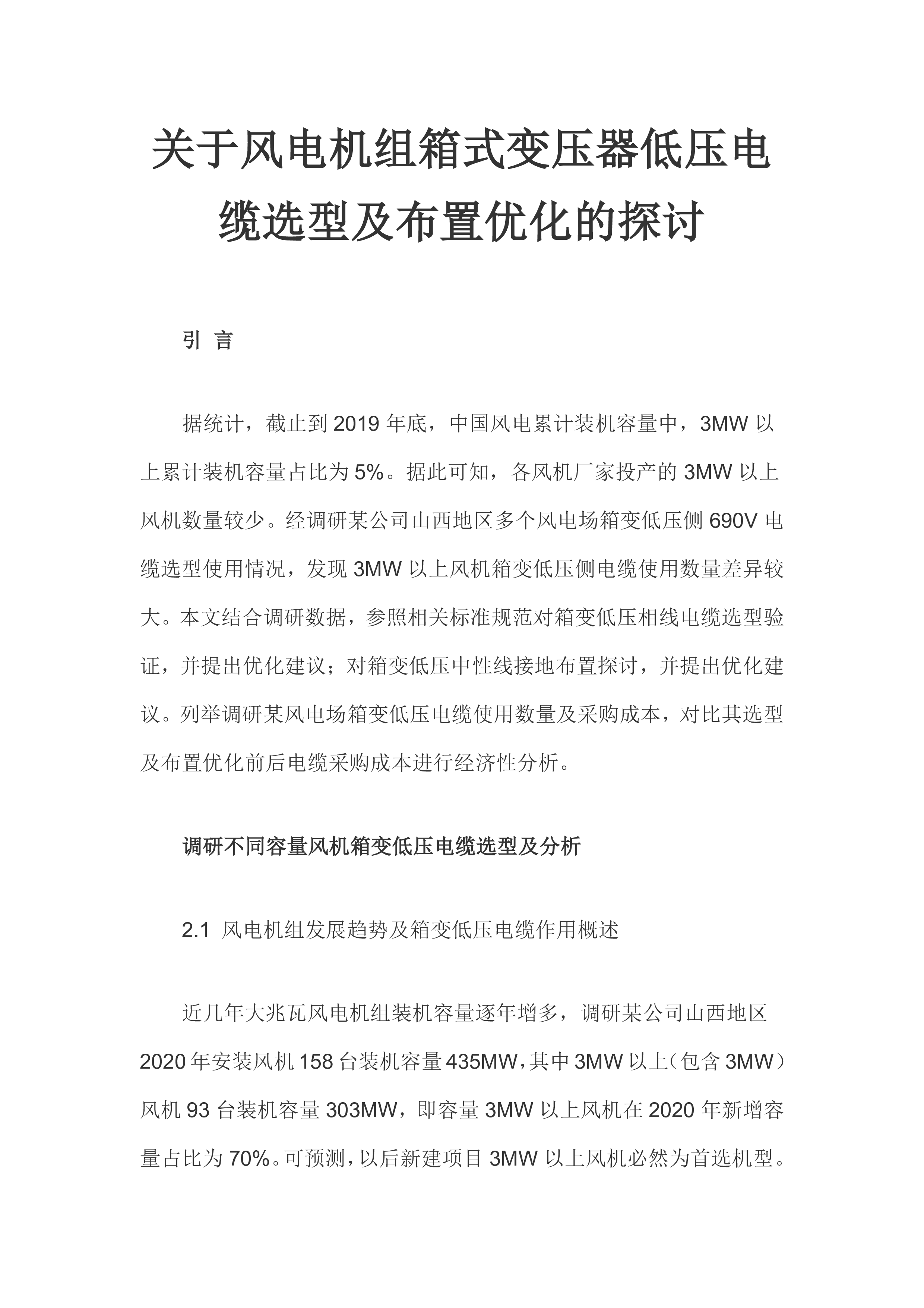 关于风电机组箱式变压器低压电缆选型及布置优化的探讨引言据统计,截止到2019年底,中国风电累计装机容量中,3MW以上累计装机容量占比为5%。据此可知,各风机厂家投产的3MW以上风机数量较少。经调研某公司山西地区多个风电场箱变低压侧690V电缆选型使用情况,发现3MW以上风机箱变低压侧电缆使用数量差异较大。本文结合调研数据,参照相关标准规范对箱变低压相线电缆选型验证,并提出优化建议;对箱变低压中性线接地布置探讨,并提出优化建议。列举调研某风电场箱变低压电缆使用数量及采购成本,对比其选型及布置优化前后电缆采购成本进行经济性分析。调研不同容量风机箱变低压电缆选型及分析2.1风电机组发展趋势及箱变低...