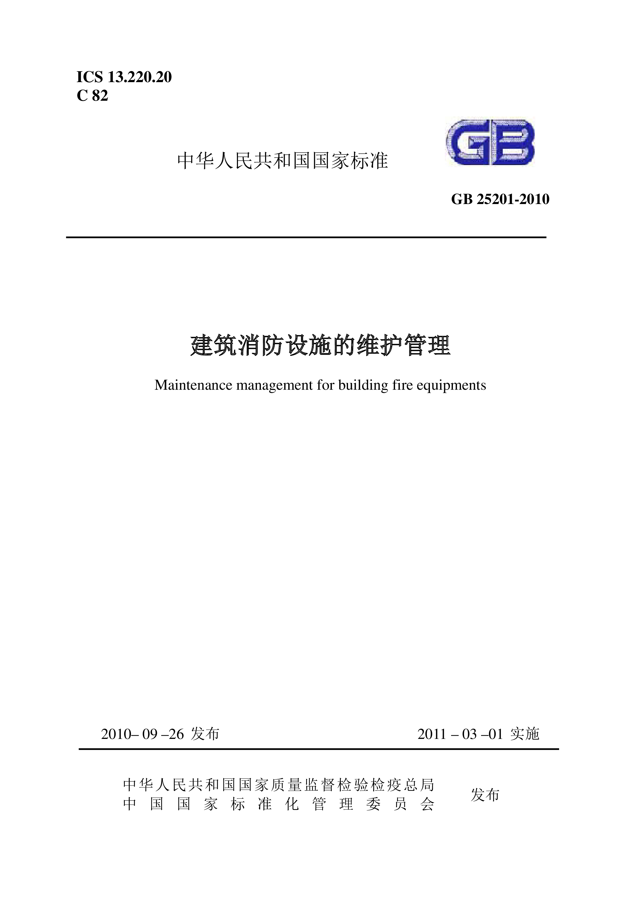 ICS13.220.20C82中华人民共和国国家标准GB25201-2010建筑消防设施的维护管理Maintenancemanagementforbuildingfireequipments2010–09–26发布2011–03–01实施中华人民共和国国家质量监督检验检疫总局中国国家标准化管理委员会发布中华人民共和国国家标准建筑消防设施的维护管理MaintenancemanagementforbuildingfireequipmentsGB25201-2010发布部门:中华人民共和国国家质量监督检验检疫总局中国国家标准化管理委员会发布日期:2010年09月26日实施日期:2011年03月01日...