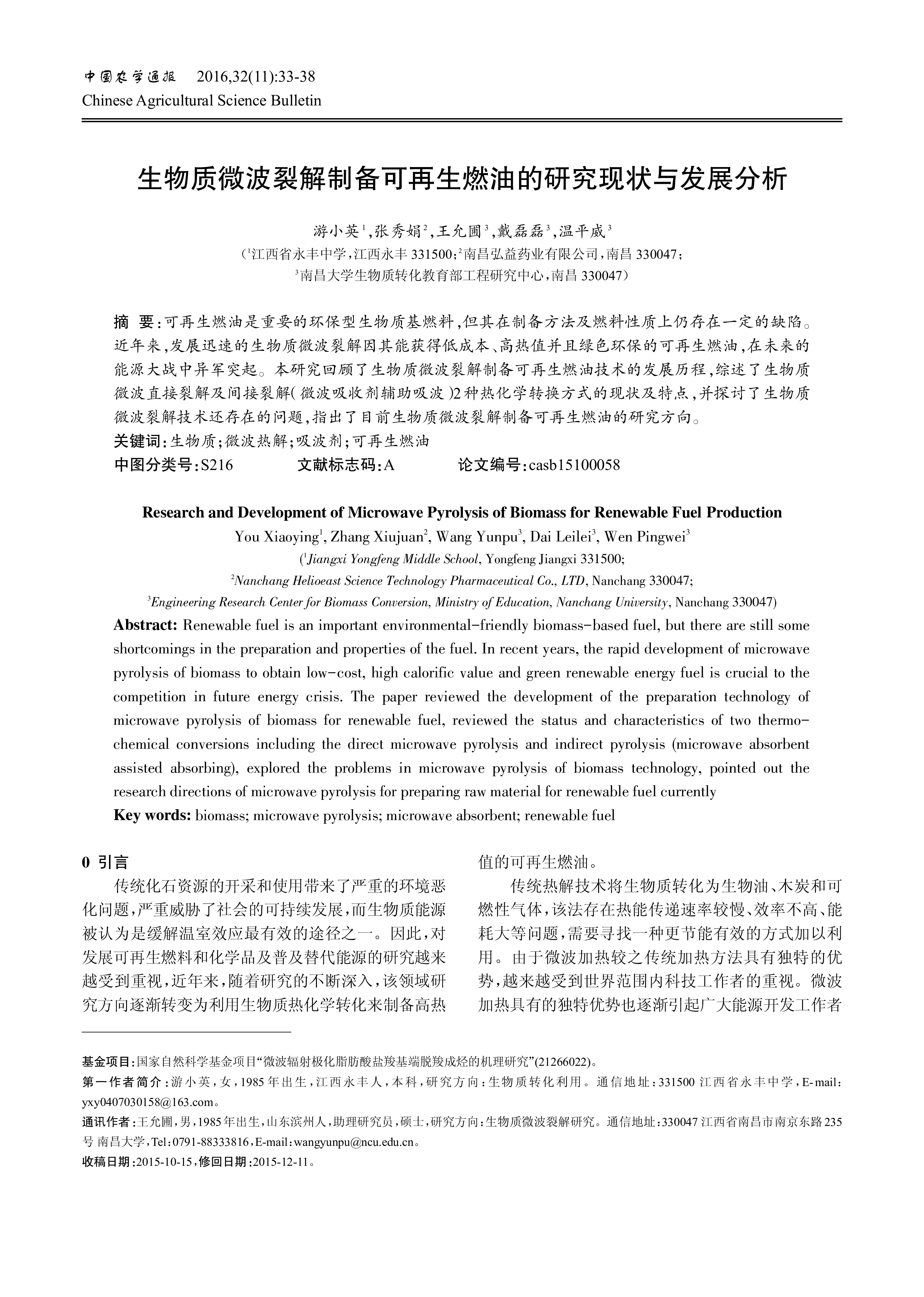 中国农学通报2016,32(11):33-38ChineseAgriculturalScienceBulletin生物质微波裂解制备可再生燃油的研究现状与发展分析游小英1,张秀娟2,王允圃3,戴磊磊3,温平威3(1江西省永丰中学,江西永丰331500;2南昌弘益药业有限公司,南昌330047;3南昌大学生物质转化教育部工程研究中心,南昌330047)摘要:可再生燃油是重要的环保型生物质基燃料,但其在制备方法及燃料性质上仍存在一定的缺陷。近年来,发展迅速的生物质微波裂解因其能获得低成本、高热值并且绿色环保的可再生燃油,在未来的能源大战中异军突起。本研究回顾了生物质微波裂解制备可再生燃油技术的发展...