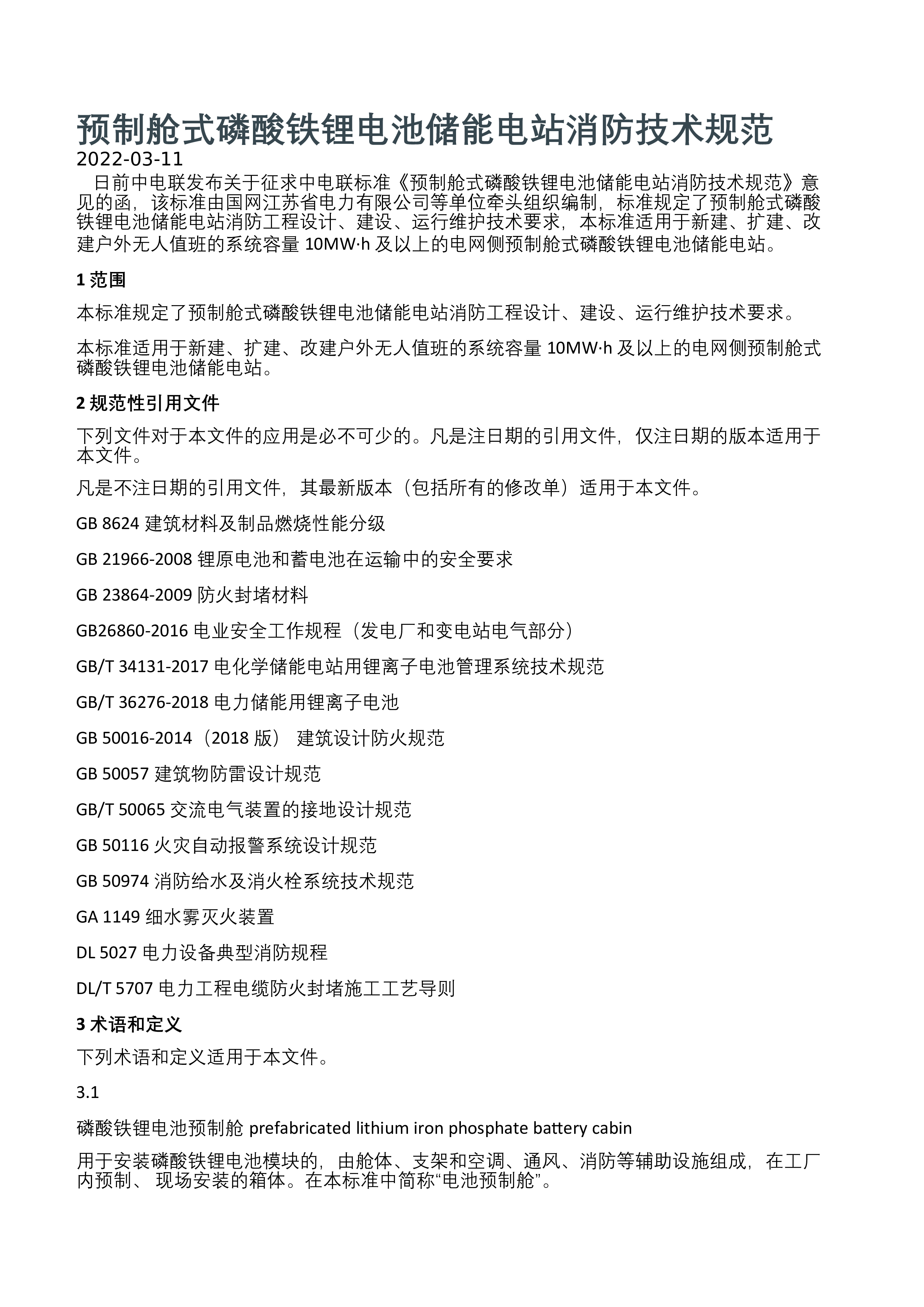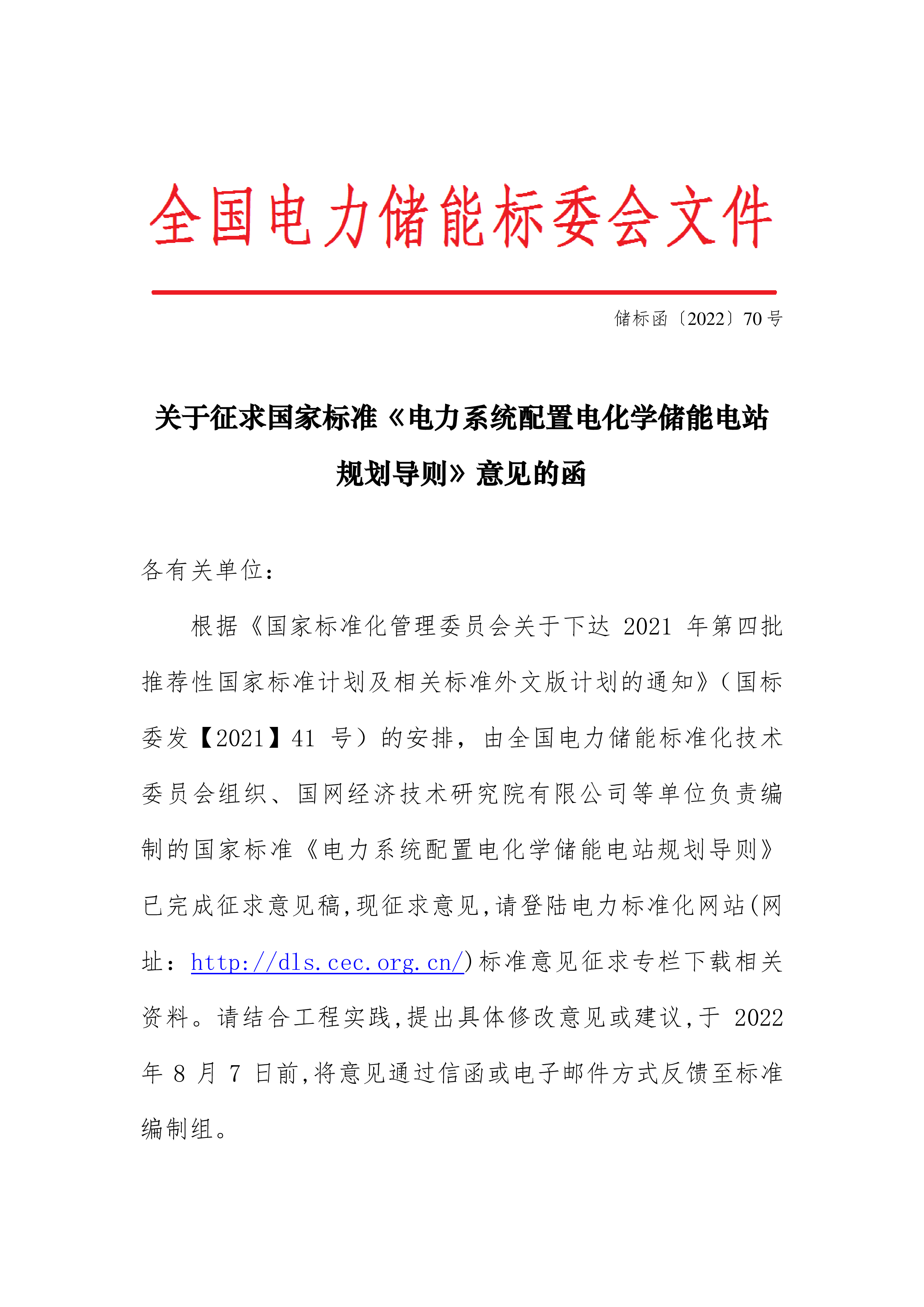 储标函〔2022〕70号关于征求国家标准《电力系统配置电化学储能电站规划导则》意见的函各有关单位:根据《国家标准化管理委员会关于下达2021年第四批推荐性国家标准计划及相关标准外文版计划的通知》(国标委发【2021】41号)的安排,由全国电力储能标准化技术委员会组织、国网经济技术研究院有限公司等单位负责编制的国家标准《电力系统配置电化学储能电站规划导则》已完成征求意见稿,现征求意见,请登陆电力标准化网站(网址:http://dls.cec.org.cn/)标准意见征求专栏下载相关资料。请结合工程实践,提出具体修改意见或建议,于2022年8月7日前,将意见通过信函或电子邮件方式反馈至标准编制组。...