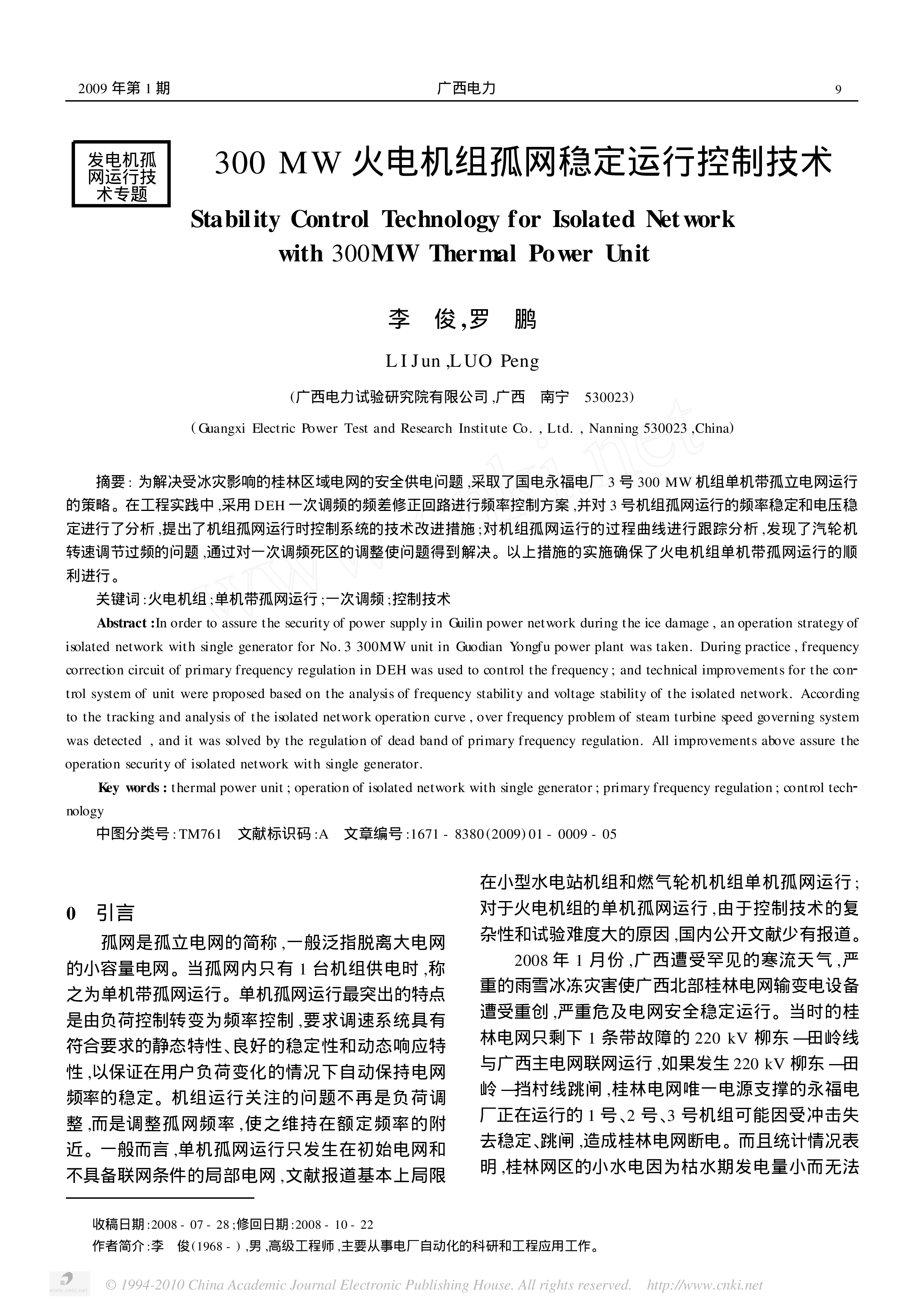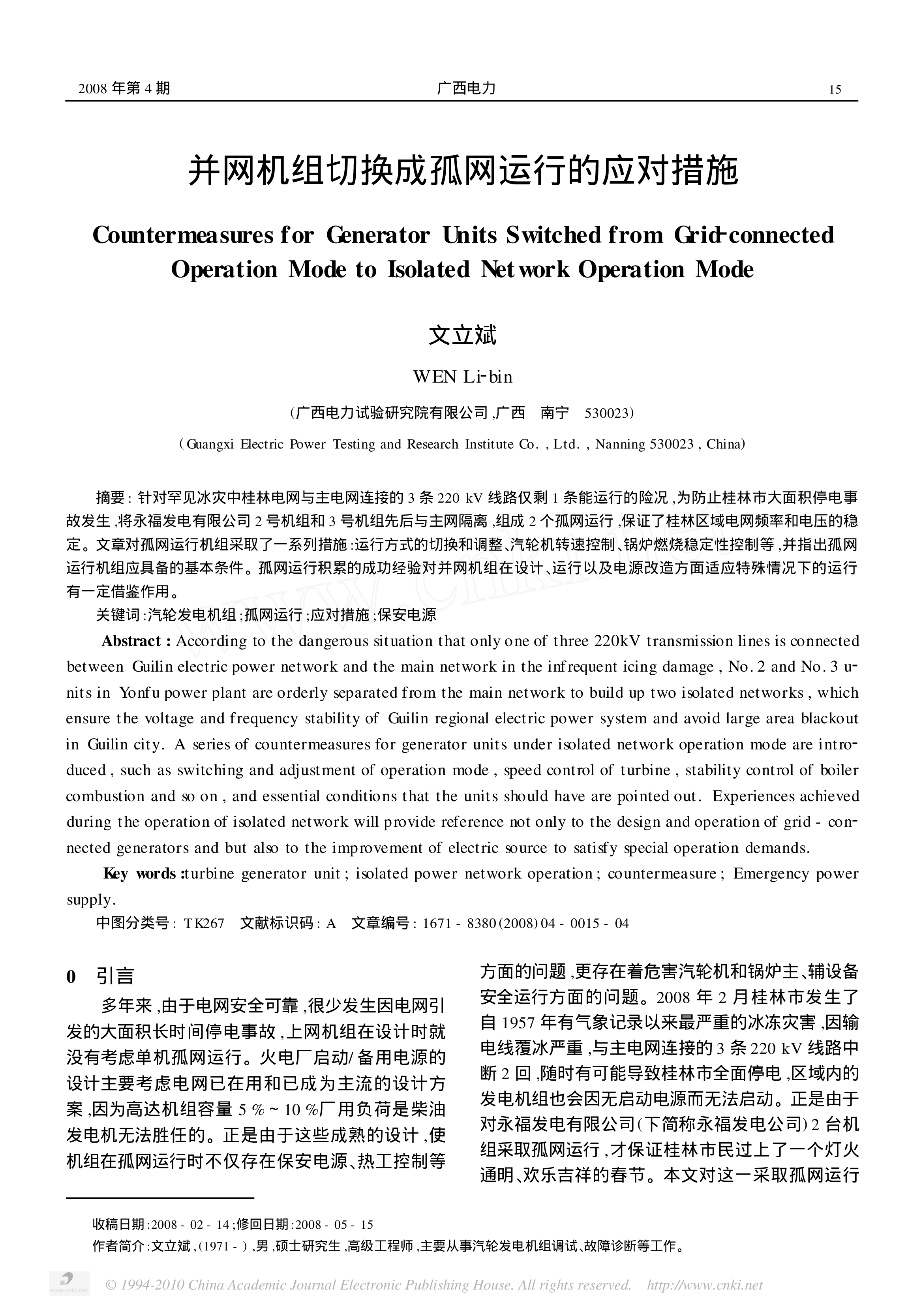 ©1994-2010ChinaAcademicJournalElectronicPublishingHouse.Allrightsreserved.http://www.cnki.netÊÕ¸åÈÕÆÚ:2008-02-14;ÐÞ»ØÈÕÆÚ:2008-05-15×÷Õß¼ò½é:ÎÄÁ¢±ó,(1971-),ÄÐ,˶ʿÑо¿Éú,¸ß¼¶¹¤³Ìʦ,Ö÷Ҫ´ÓÊÂÆûÂÖ·¢µç»ú×éµ÷ÊÔ¡¢¹ÊÕÏÕï¶ÏµÈ¹¤×÷¡£²¢Íø»ú×éÇл»³É¹ÂÍøÔËÐеÄӦ¶Ô´ëʩCountermeasuresforGeneratorUnitsSwitchedfromGrid2co...